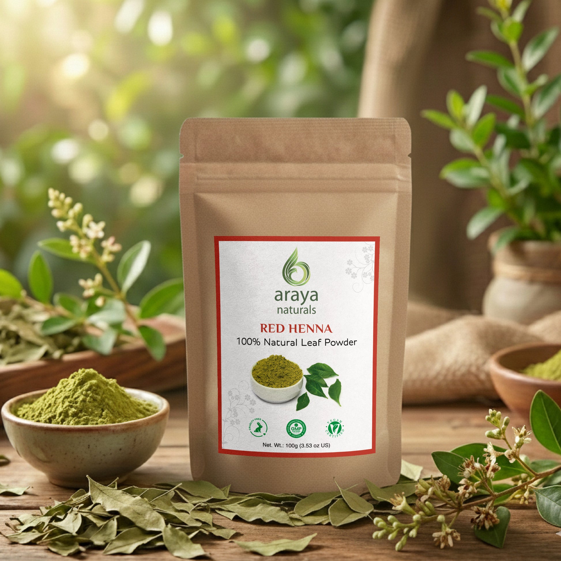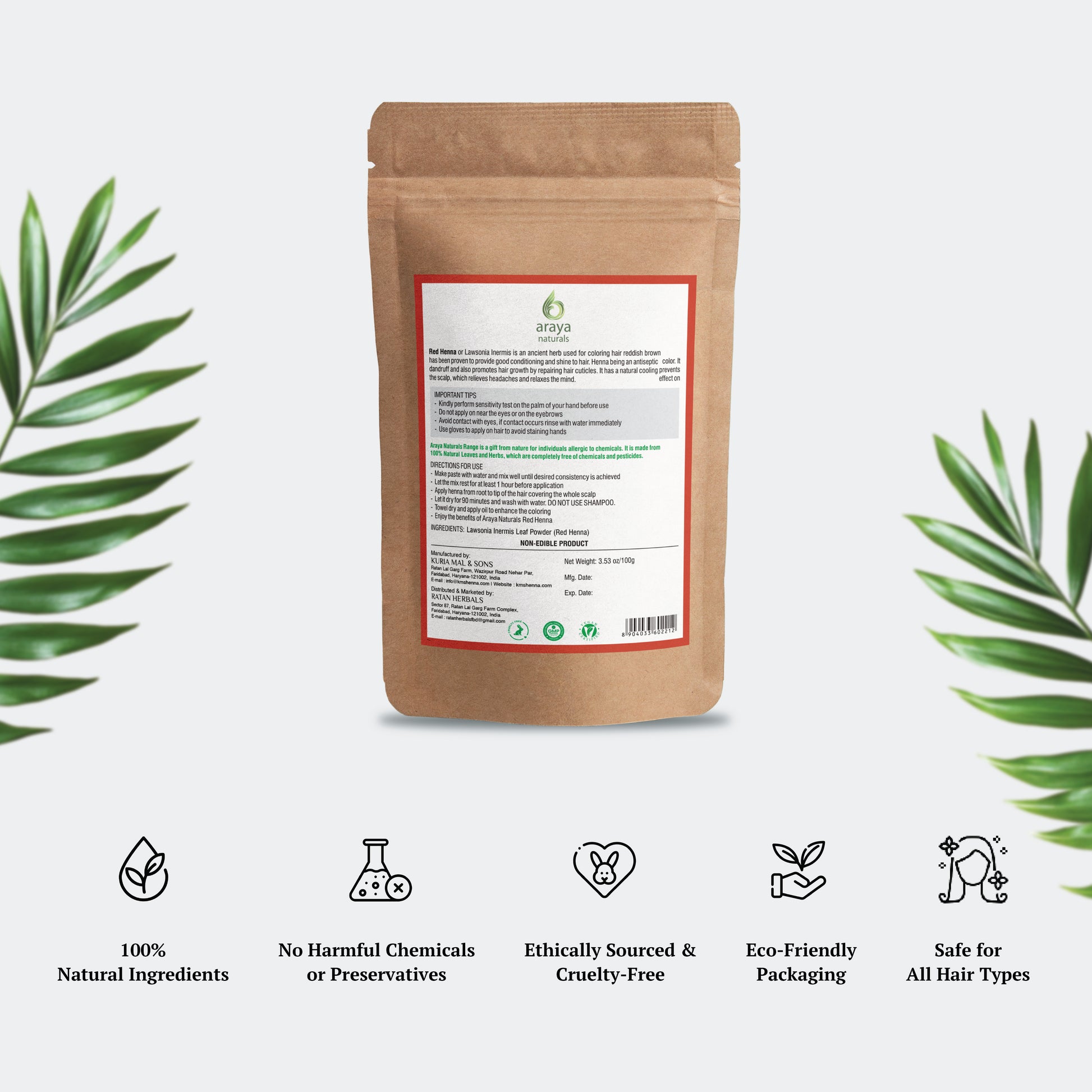 Red Henna powder derived from 100% Natural Henna leaves, sourced from organic certified farmers of Rajasthan, India. It offers a reddish-brown hair color with natural shines and luster.